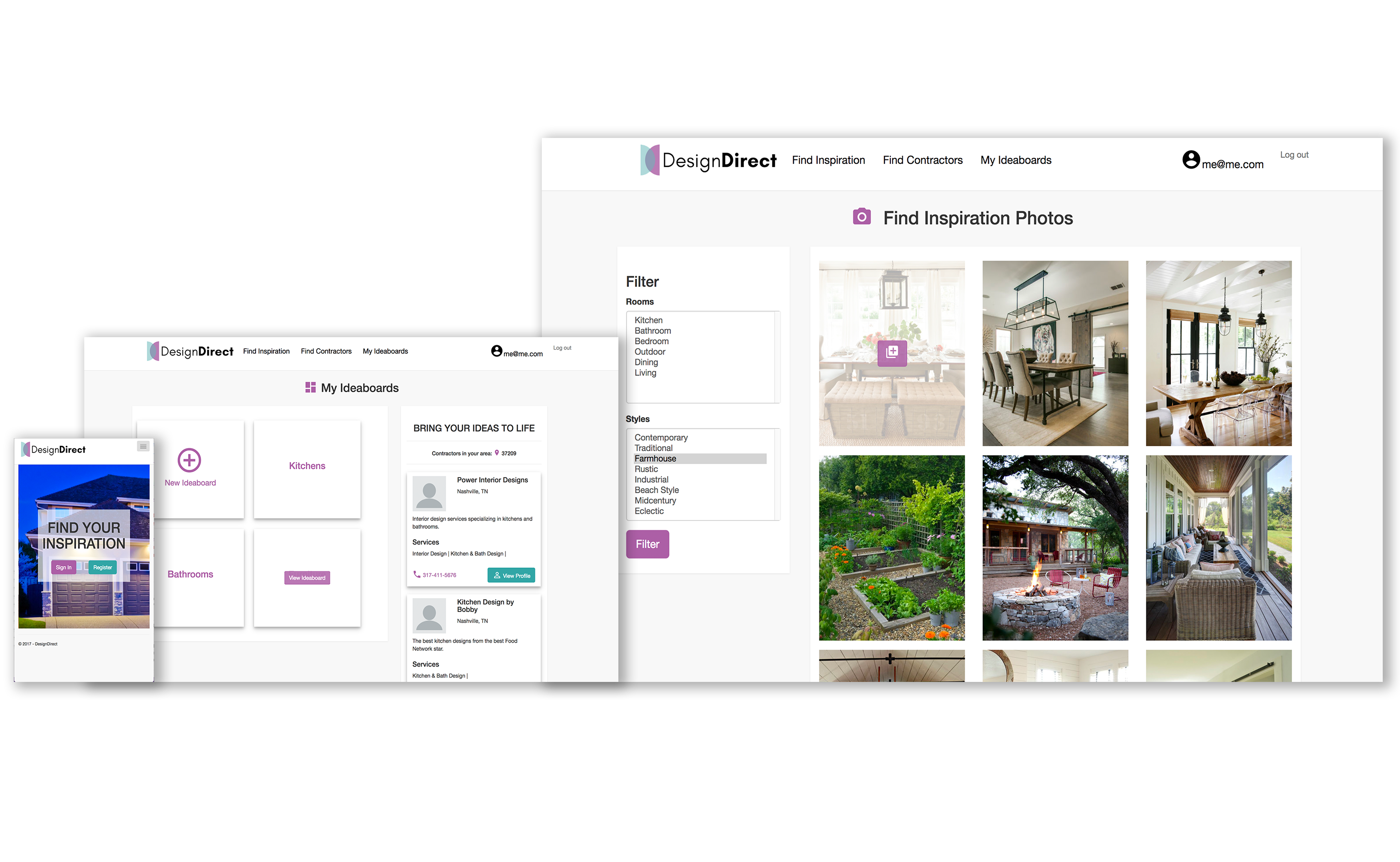 A web application resource that enables users to find photo inspiration for home design and connect with contractors in their area. Users create an account to save their favorite photos to boards. The app displays relevant contractor profiles based on tags associated with the images that are saved on the user's boards. Users can also connect with contractors by filtering the service they need.